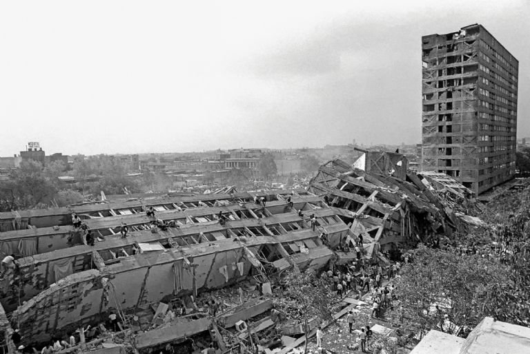 El terremoto de 8.1 grados que sacudió a la urbe a las 07:17 horas dejó miles de muertos y una espesa nube de humo y polvo de los inmuebles destruidos, entre ellos el edificio Nuevo León en Nonoalco Tlatelolco (izquierda), uno de los símbolos de la tragedia.