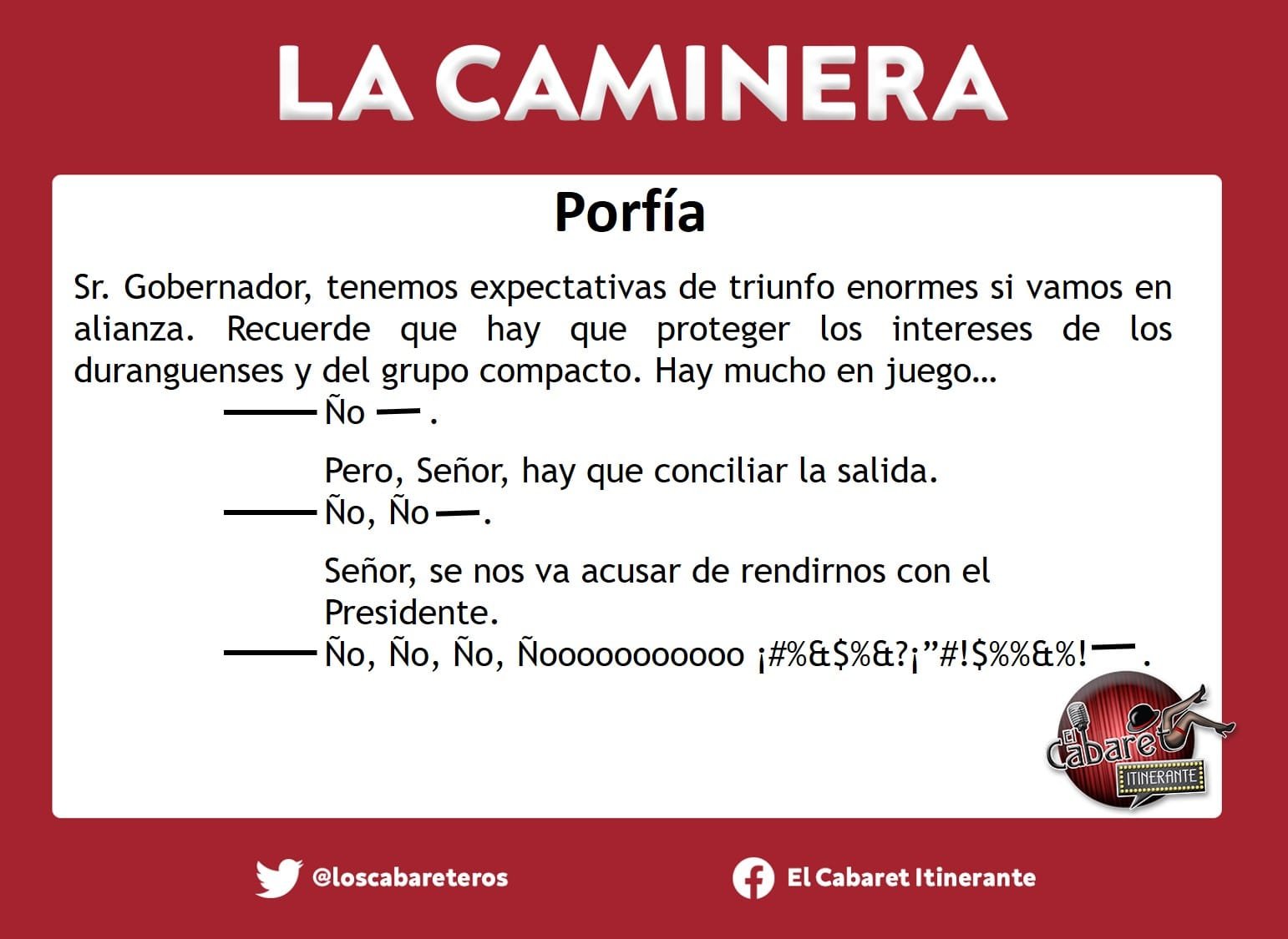 Porfía Leonardo Álvarez 13 marzo, 2022 Sr. Gobernador, tenemos expectativas de triunfo enormes si vamos en alianza. Recuerde que hay que proteger los intereses de los duranguenses y del grupo compacto.