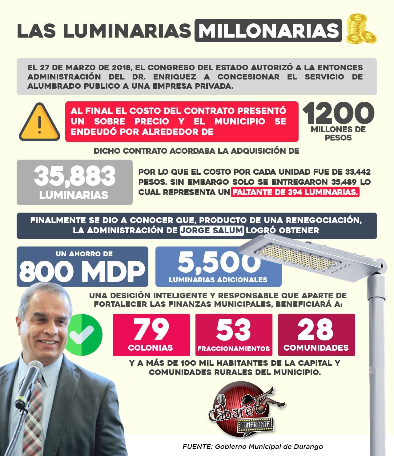 Derivado de la renegociación del contrato de luminarias autorizada durante la administración de José Ramón Enríquez, el Gobierno Municipal de Durango a cargo de Jorge