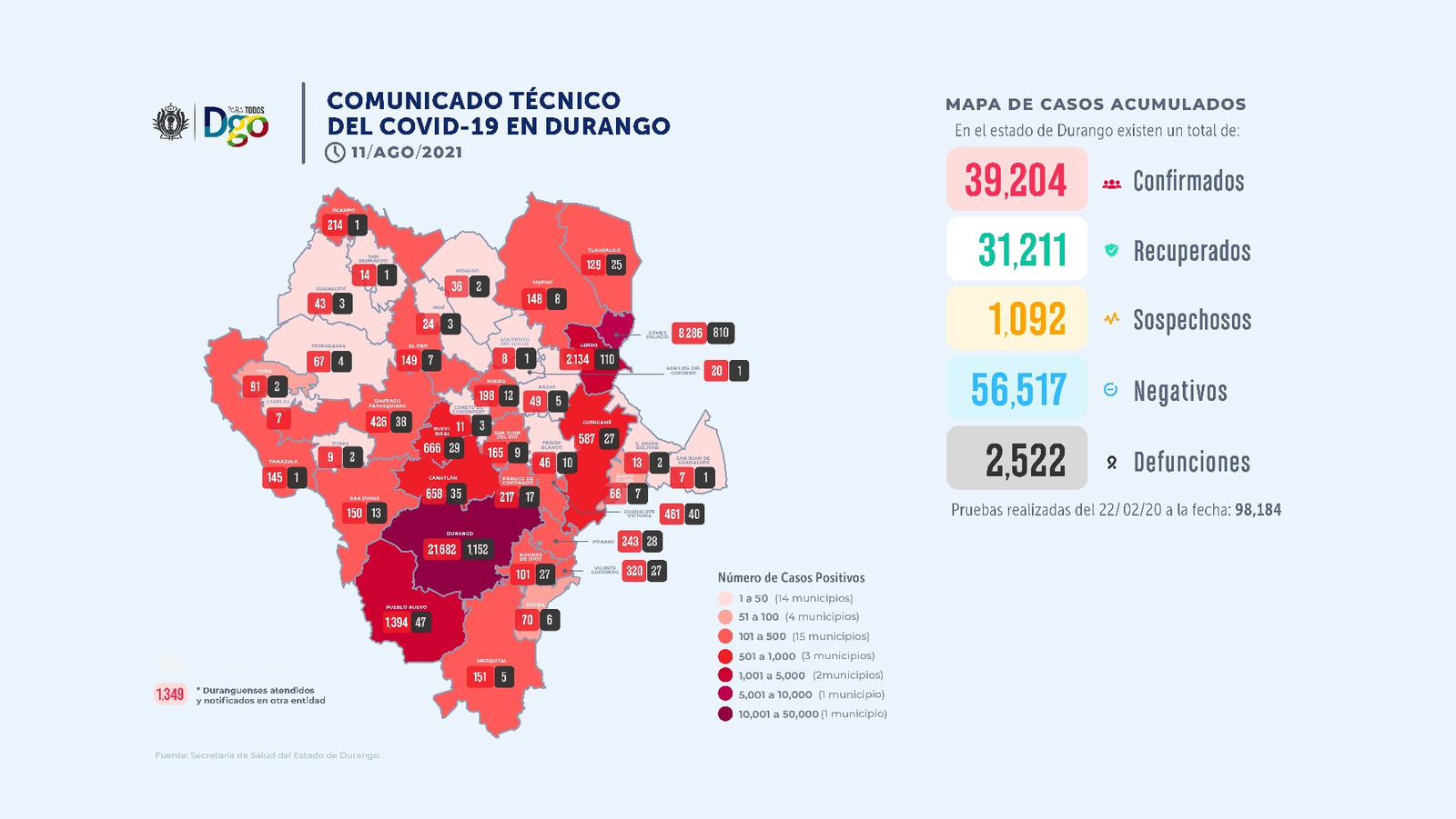 La Secretaría de Salud del estado de Durango informó que a la fecha la entidad alcanzó los 39 mil 204 casos de Covid-19, con 31