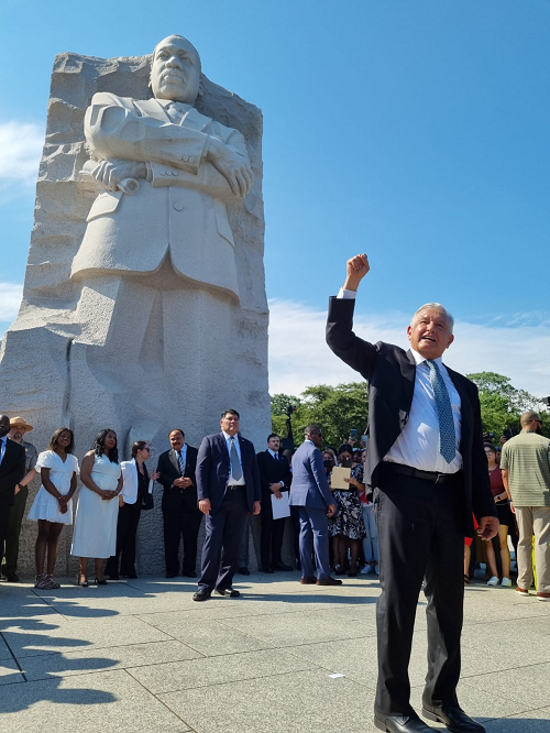 El presidente Andrés Manuel López Obrador visitó este martes el Monumento a Martin Luther King y del expresidente estadounidense Franklin D. Roosevelt durante su visita