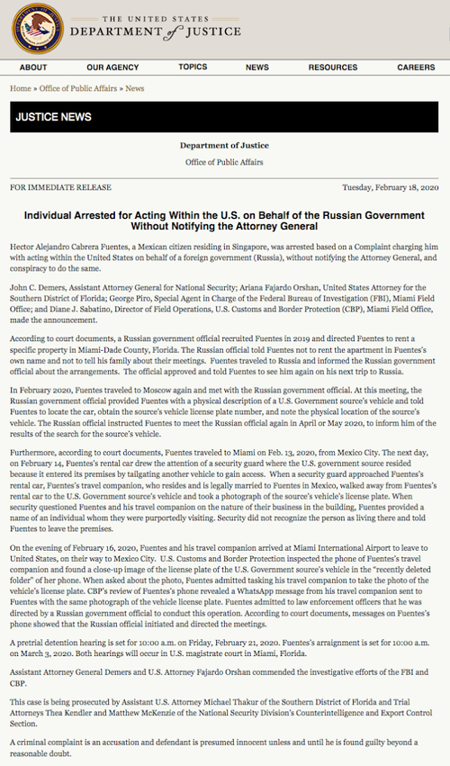 De acuerdo con el expediente, la próxima reunión con el funcionario ruso iba a celebrarse en abril o mayo de 2020 y en ella Cabrera le iba a pasar la información obtenida, pero antes fue detenido en Miami.