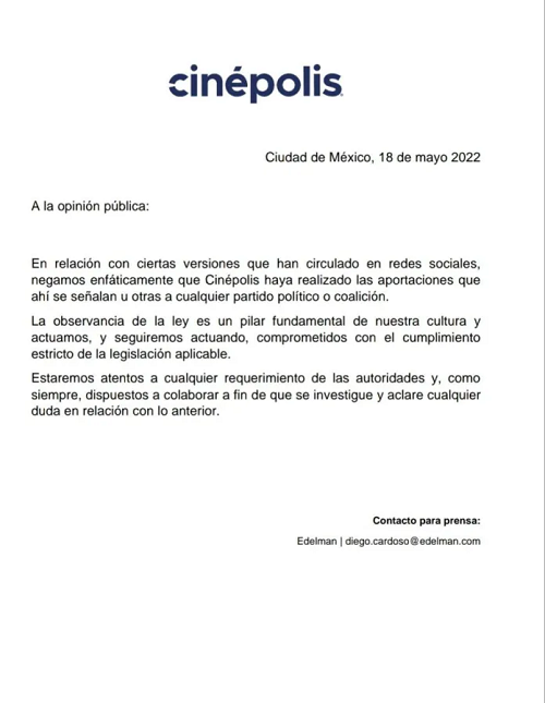 En un comunicado, la compañía negó enfáticamente que Cinépolis haya realizado aportaciones para legisladores de Michoacán, las cuales fueron señaladas por el priista en el audio, y aseguró que colaborará con el Gobierno en caso de que se le haga un requerimiento.