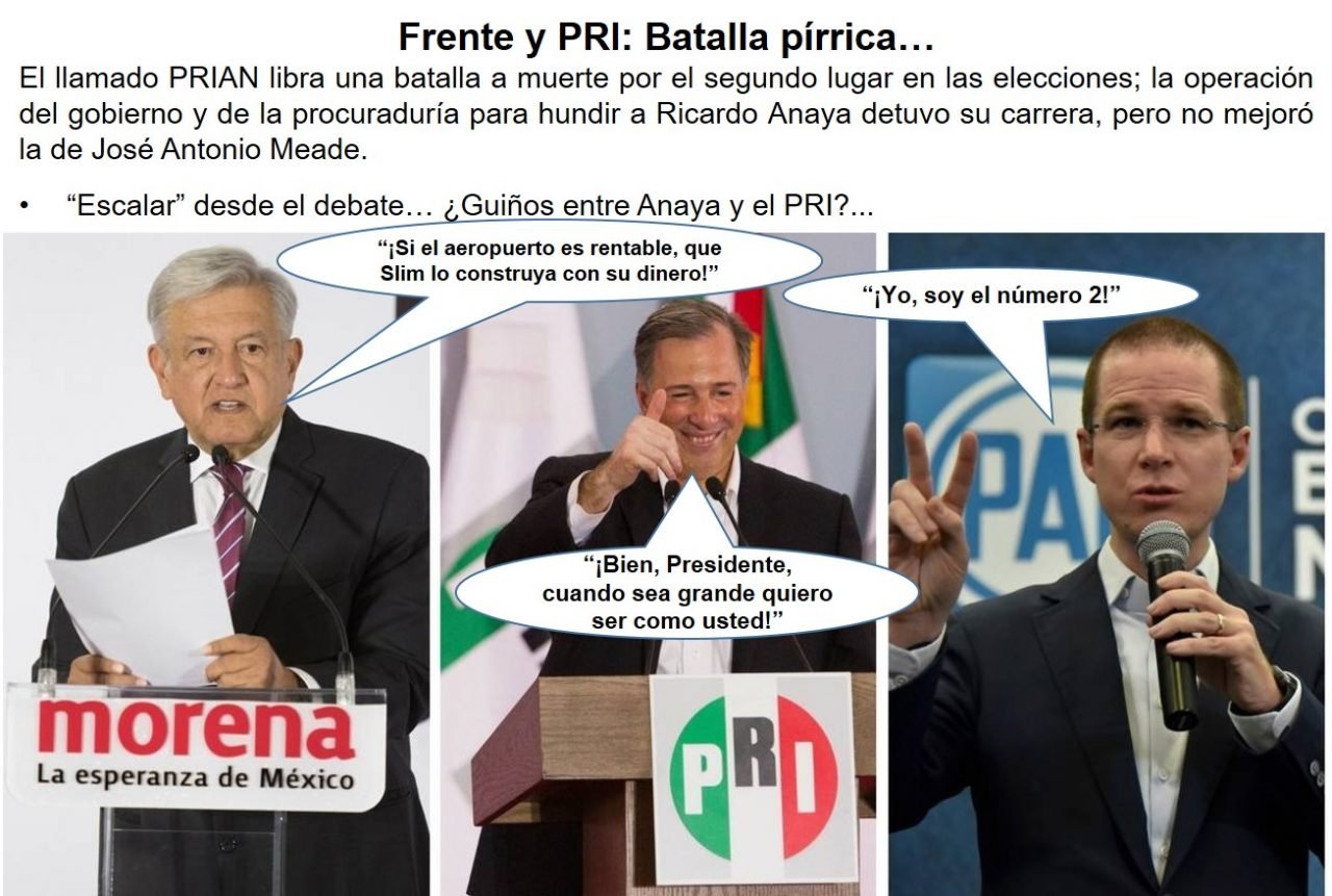 El próximo debate presidencial va a ser ocupado como un trampolín por quienes van abajo en las encuestas. En La Jornada, el periodista Julio Hernández López, escribe que: “el debate del próximo domingo es asumido en varios flancos adversos a Andrés Manuel López Obrador como una excepcional oportunidad de marcar diferencias e incentivar una plataforma de crecimiento artificial que permita acortar distancias respecto del actual delantero casi en fuga. En esencia, los equipos de José Antonio Meade y de Ricardo Anaya creen posible que el domingo se haga visible un contraste entre la oratoria y las propuestas del cuasipriísta y del panista, frente a lo que haga y diga el morenista. De darse esa diferenciación tajante, los contrarios a Andrés Manuel López Obrador podrían comenzar una escalada mediática, demoscópica y política en busca de empatar al puntero e ir fabricando la hazaña del rebase y la superación. En preparación de ese ambiente hostil para el tabasqueño, se han producido hechos y declaraciones que van de la confrontación entre cetemistas y profesores en Puerto Escondido, Oaxaca, hasta la acometida verbal de Carlos Slim en defensa del nuevo aeropuerto internacional, pasando por el peculiar sondeo de un diario capitalino entre universitarios […], en el que por primera vez ha aparecido a la cabeza el panista Anaya, y la amplia difusión de una fotografía en la que el abanderado de Morena aparece como viajero en un taxi aéreo. El sondeo en mención (no una encuesta) tuvo como respuesta en Internet la promoción de una etiqueta, #UniversitariosConAMLO, que alcanzó primeros lugares en el escaparate mundial de los temas que hacen tendencia. Otro punto que durante horas fue usado en contra del tabasqueño fue la ausencia de su firma (y de su consecuente compromiso gráfico) en una iniciativa impulsada por más de 300 instituciones (que) conforman el Pacto por la Primera Infancia, siendo la única iniciativa ciudadana que compromete a todos los actores de la sociedad a priorizar los derechos de la niñez temprana y así, solucionar desde la raíz las problemáticas de impacto social que impiden el crecimiento de México. A la distancia geográfica, Andrés Manuel López Obrador hizo saber que suscribía los términos de esa iniciativa pero, aún así, en la página correspondiente seguía apareciendo, a la hora de cerrar esta columna, la mención de que el tabasqueño no se había comprometido con el proyecto”.