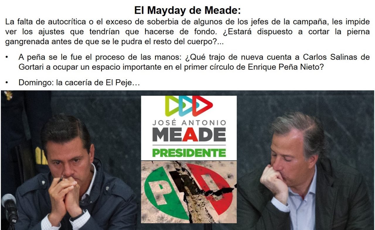 “Mayday” es una de las palabras que menos se buscan en los diccionarios. Es una derivación del francés que significa “ayúdame”, que originalmente fue la radioseñal internacional utilizada por los barcos y aviones en situaciones de emergencia para solicitar auxilio. La señal se comenzó a emplear de manera común como palabra, recuerda Wikipedia, que representaba un peligro inminente, y donde muchas veces se estaba en riesgo de perder la vida. “Mayday” es lo que se aplica hoy a la campaña del oficialista José Antonio Meade, que necesita auxilio, no sólo para ver si existe alguna posibilidad de ser competitivo en la contienda por la Presidencia, sino incluso para evitar, de mantenerse la tendencia en la mayoría de las encuestas, hundirse en el tercer lugar. Mantener la Presidencia no es lo único en peligro. Está en riesgo obtener bancadas sólidas en el Senado y el Congreso, y evitar, en el colapso que se anuncia, el fin del PRI como hoy lo conocemos. Existe una desconexión entre lo que se piensa en el equipo de Meade y lo que se cree en otros lados, incluso en Los Pinos, donde de acuerdo con personas que han escuchado al presidente Enrique Peña Nieto, está preocupado por el rumbo de la campaña. Dentro de la campaña, ha trascendido de sus cuartos de guerra, hay un problema de desorganización, con muchos generales y muchas voces que opinan y hacen, ante la ausencia de un liderazgo firme en la jefatura de campaña de Aurelio Nuño. El jefe de todos no es respetado por muchos. Su apoyo, el presidente del PRI, Enrique Ochoa, es un fusible quemado que ha desaparecido de la arena pública, empujado por la ignominia de la opinión pública y el desprecio de los priistas. Una vez más, hay que reiterarlo, esta visión no es compartida por quienes están en la campaña. La falta de autocrítica, o el exceso de soberbia de algunos de los jefes de la campaña, absortos en el proceso endogámico de la toma de decisiones, les impide ver los ajustes que tendrían que hacerse de fondo. La solución, sin embargo, está a la vista, pero es altamente dolorosa, para el equipo y para el propio Peña Nieto: cambiar a los jefes de la campaña. Esta decisión no está en las manos de Meade, sino en las de Peña Nieto. ¿Estará dispuesto a cortar la pierna gangrenada antes de que se le pudra el resto del cuerpo? (…) Es cierto que el descrédito del PRI jala hacia abajo a Meade en las preferencias electorales, pero hay una verdad política: sin el PRI, no tiene mayor posibilidad el candidato de nada; con el PRI, al menos, puede hacer el intento. También es cierto que, aun con esta revolución interna, Meade no tiene un horizonte promisorio en estos momentos, sino más bien ominoso. Sin embargo, si las cosas están mal, pueden ponerse peor”.