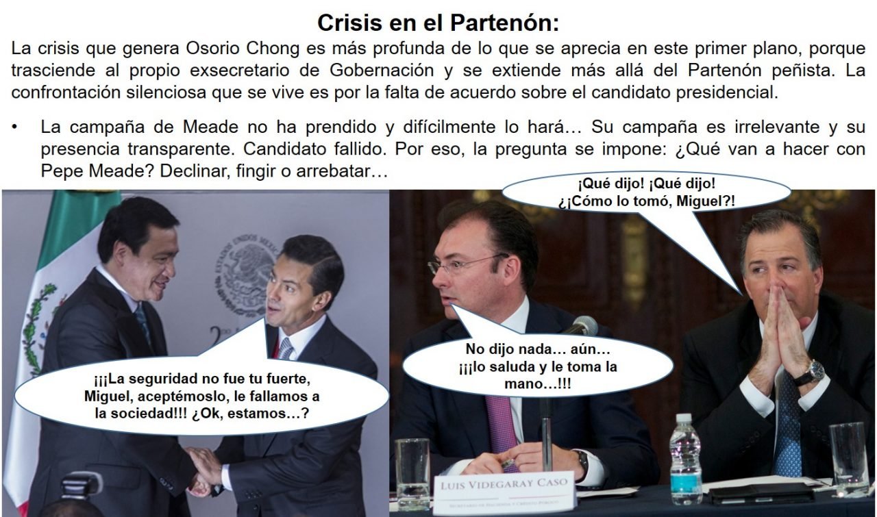 Raymundo Rivapalacio escribe en El Financiero sobre la crisis del grupo compacto en el PRI: “Cuando llegó a la Presidencia, Enrique Peña Nieto tenía un equipo compacto de tres pilares: el de Luis Videgaray, su secretario de Hacienda; el de Miguel Ángel Osorio Chong, secretario de Gobernación, y el de Aurelio Nuño, jefe de la Oficina en Los Pinos. La sucesión presidencial quebró ese equipo, los distanció y los enfrentó. Hoy en día, esa brecha se ha profundizado. En las antípodas del kitchen cabinet de Peña Nieto se encuentra quien se sintió injustamente relegado de la candidatura presidencial, que se sentía con los méritos y que hoy está haciendo campaña para él, no buscando los votos para el candidato José Antonio Meade. Es la rebelión de Miguel Ángel Osorio Chong, que ha generado un conflicto en gran ebullición en los pasillos palaciegos. Osorio Chong, número dos en la lista plurinominal del PRI al Senado, es el responsable de las campañas de los candidatos a senadores. Sin embargo, el trabajo de articular la búsqueda de votos para esa cámara y la de votos para Meade, ha sido deliberadamente incumplido. En los últimos 10 días, Osorio Chong ha estado en eventos priistas con candidatos al Senado en Chihuahua, Hidalgo, Puebla y Sinaloa, donde ha hecho las arengas para que peleen por los votos, pero en ningún momento ha mencionado a Meade, ni apelado a que también trabajen para granjearle sufragios en la urna presidencial. Priistas que han estado en esas reuniones han registrado extrañados la actitud del exsecretario de Gobernación. La acción de Osorio Chong no puede decirse que haya sido resultado de una actitud producida por el berrinche por no haber sido el candidato presidencial. Tras la unción de Meade, fue lastimado innecesariamente por el equipo que se quedó con la candidatura. La primera señal abierta de la hostilidad fue la selección de su suplente en el Senado, Francisco Guzmán, incondicional de Peña Nieto, y quien sustituyó a Nuño en la Oficina de la Presidencia. La cuña, de acuerdo con un priista que entiende los mensajes del poder, equivalía al recordatorio permanente que en cualquier momento podrían quitarlo del Senado. El maltrato a Osorio Chong tocó niveles extraordinarios la semana pasada, cuando Peña Nieto admitió públicamente que la estrategia de seguridad había fallado. (…) Pero la crisis que genera Osorio Chong es más profunda de lo que se aprecia en este primer plano, porque trasciende al propio exsecretario de Gobernación y se extiende más allá del Partenón peñista. La confrontación silenciosa que se vive es por la falta de acuerdo sobre el candidato presidencial, lo que deja de manifiesto que ni Peña Nieto, ni Ochoa o Nuño, negociaron con efectividad los respaldos del partido para Meade. (…) La campaña de Meade no ha prendido y difícilmente lo hará. No tiene la fuerza ni la contundencia, o la inteligencia estratégica, para salir adelante. A Peña Nieto sólo le queda una elección de Estado, que están comenzando a hacer –referida en este espacio el lunes como “La Operación Meade”– y empapar de dinero a los electores. Pero aun así, no se ve que pueda ser suficiente. La campaña se pudrió por dentro y apesta, aunque no quieran darse cuenta. La actitud de Osorio Chong, en todo caso, sería el axioma dominante entre un buen número de priistas: sálvese el que pueda”.