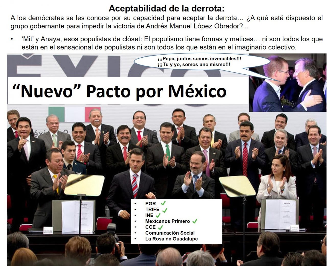 En la redacción del portal SinEmbargo se escribe respecto al guiño de Ricardo Anaya de ir con Meade contra López Obrador: “Apenas el 5 de marzo, el candidato de la coalición “Por México al Frente” aseguró que de ganar la Presidencia metería a la cárcel a Peña. “Por supuesto que sí. Ya estuvo bueno de que haya intocables en nuestro país, aquí el que la haya hecho la tendrá que pagar, y esto incluye al Presidente de la República, Enrique Peña Nieto”, dijo. La revista Proceso dio a conocer ayer que, ante miembros del grupo financiero Citibanamex, Anaya manifestó “de manera expresa su disposición a hablar directamente con el Presidente Enrique Peña Nieto para ‘construir’ una alianza que derrote a López Obrador”. Y hoy dijo, ante reporteros que lo cuestionaron por lo que dijo en Citibanamex: “Bajo ninguna circunstancia estaría yo dispuesto a realizar un pacto de orden cupular, no creo en ello y estoy absolutamente en contra del pacto de impunidad”.