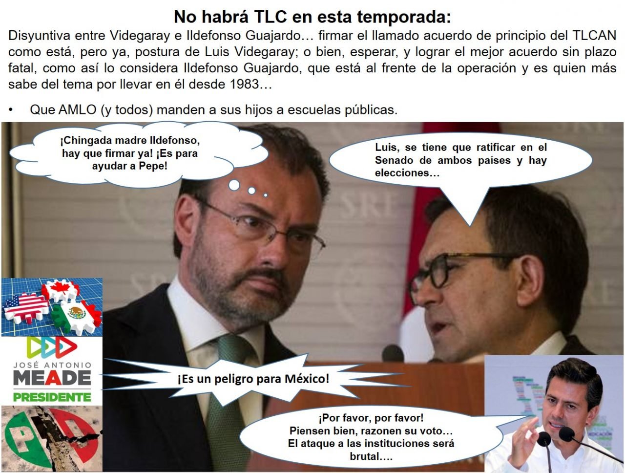 La idea de que la renegociación del Nuevo Tratado del Libre Comercio de América del Norte quedara en esta semana se ha ido. En Milenio, Joaquín López Dóriga, escribe que: “en Los Pinos se le presentó al Presidente Enrique Peña Nieto una disyuntiva: firmar el llamado acuerdo de principio del Tratado de Libre Comercio de América del Norte (TLC) como está, pero ya, postura por la que se inclinaría el canciller Luis Videgaray en un afán de dejar ese tema cerrado y dar la certidumbre que la renegociación implica, o la de lograr el mejor acuerdo posible para México, sin plazo fatal, que es la visión del secretario de Economía, Ildefonso Guajardo, que está al frente de la operación y que quien más sabe del tema por llevar en él desde 1983, cuando en aquel año se firmó el primer NAFTA, siendo presidente Carlos Salinas de Gortari para que entrara en vigor en el primer minuto del 1 de enero de 1994, […]. El viernes pasado, el líder del Congreso de Estados Unidos, el representante republicano Paul Ryan, dio como ultimátum para la firma el 17 de mayo, que es mañana jueves, lo que según un participante en las negociaciones se antoja poco probable dado el número de temas que hay que resolver, a lo que el ex embajador de Estados Unidos en México Carlos Pascual me dijo el viernes pasado que llevaban seis de 30 capítulos. Así que el Tratado de Libre Comercio no se firmará en esta ronda, lo que lo llevará, en el mejor de los casos, al 15 de noviembre, en los últimos días de la actual legislatura estadunidense, cuando aquí se haya dado el relevo del Congreso y al gobierno de Peña Nieto le queden dos semanas, aunque las negociaciones seguirán. Aun así, que es una posición optimista, el nuevo Tratado de Libre Comercio quedará para el próximo gobierno. El reto es quién será el nuevo negociador que yo dejaría, si me preguntan, que nadie me ha preguntado, a un profesional, que es Ildefonso Guajardo, por encima de quién gane las elecciones”.