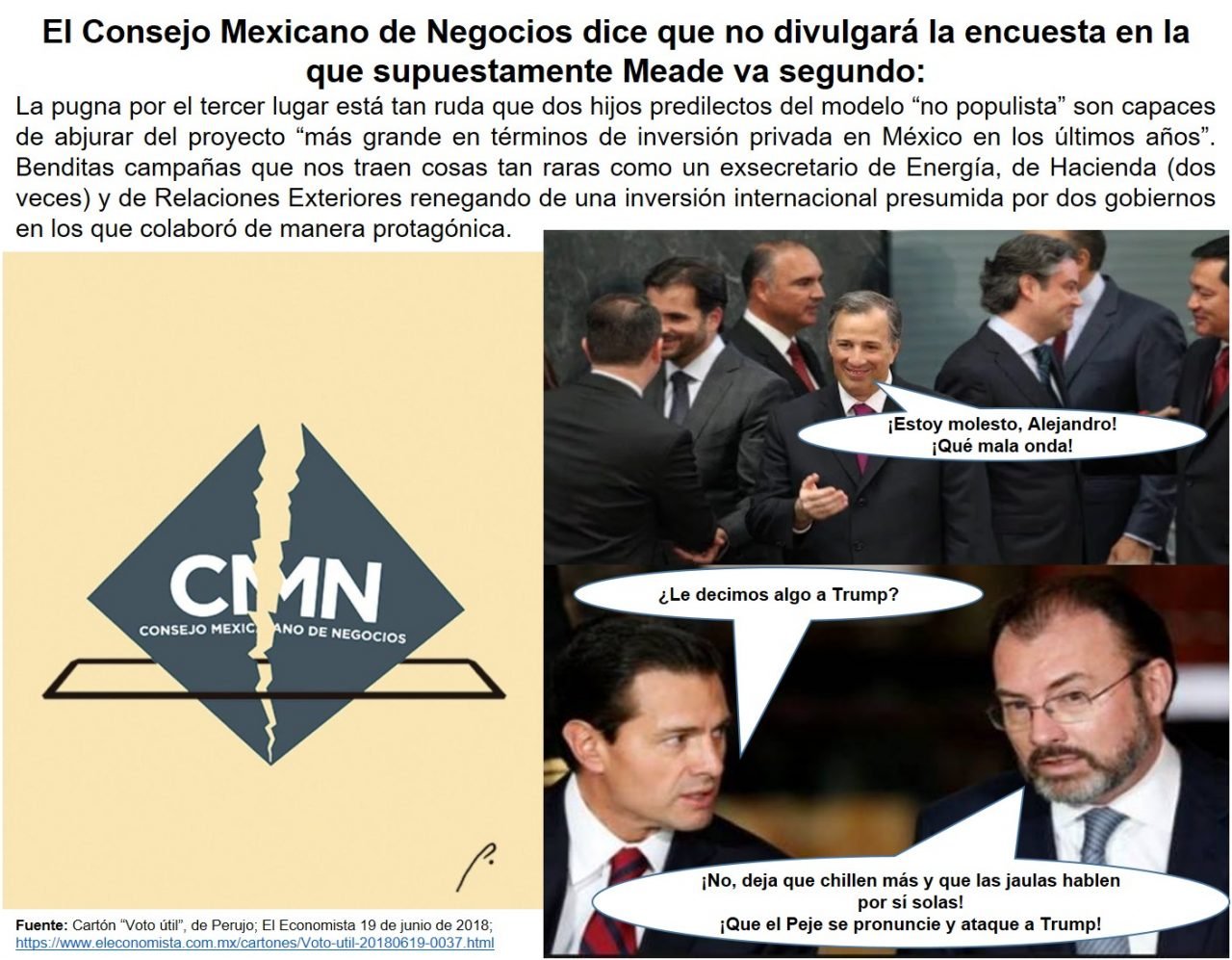 En la Unidad de Datos del portal SinEmbargo, al respecto, se escribe lo siguiente: “José Antonio Meade Kuribreña emitió el tuit para agradecer el apoyo del Consejo Mexicano de Negocios (CMN), luego de versiones que apuntan a que su presidente, Alejandro Ramírez, ocultara una supuesta encuesta en la que el abanderado del Partido Revolucionario Institucional (PRI) aparecía en el segundo lugar de las preferencias electorales, desplazando a Ricardo Anaya Corte, candidato de “Por México al Frente”. Por su parte, el CMN emitió un comunicado en el que señala que los estudios de opinión que encarga “son de consumo interno”, por lo que “no existe obligación alguna para darlos a conocer”. El consolidado de encuestas de la empresa extranjera de medios Bloomberg, da un porcentaje de 51.5 por ciento a López Obrador; Anaya tiene 24.4, y Meade 21.2 por ciento”.