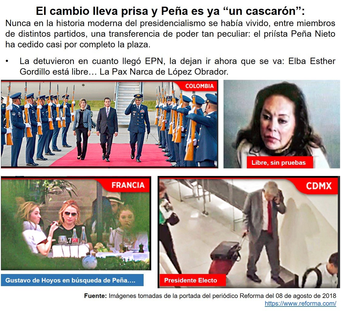 Desde la redacción de @loscabareteros ponemos a su consideración la “Columna de columnas nacional” del miércoles 08 de agosto de 2018. El cambio lleva prisa y Peña es ya “un cascarón”: Nunca en la historia moderna del presidencialismo se había vivido, entre miembros de distintos partidos, una transferencia de poder tan peculiar: el priísta Peña Nieto ha cedido casi por completo la plaza. La detuvieron en cuanto llegó EPN, la dejan ir ahora que se va: Elba Esther Gordillo está libre… La Pax Narca de López Obrador.