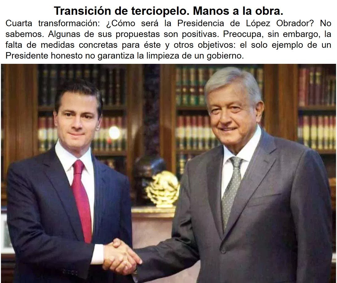 En el Excélsior, su columna de trascendidos, Frentes Políticos, asegura que el encuentro entre Peña Nieto y López Obrador debe ser visto como una disposición de ambos para llevar una transición pacífica: “apenas Andrés Manuel López Obrador, presidente electo, salía de su segundo encuentro con Enrique Peña Nieto, en Palacio Nacional, cuando el primer mandatario subió a su cuenta de Twitter: ‘Me reuní con el Presidente Electo @lopezobrador, a quien le reiteré la disposición del Gobierno de la República de apoyarlo y colaborar para una transición eficiente y eficaz en beneficio de México’. Parecería muy escueto el mensaje, pero conlleva la convicción de trabajar por la salud de la nación. El vox populi, en su afán de darle explicación a todo, supone tratos, canjes, componendas, pactos secretos. Se trata sólo de hacer lo más eficaz posible la transición. Ya la historia y la justicia se encargarán de juzgar a los que se van y, sobre todo, a los que llegan. Que no nos van a fallar, dicen”.
