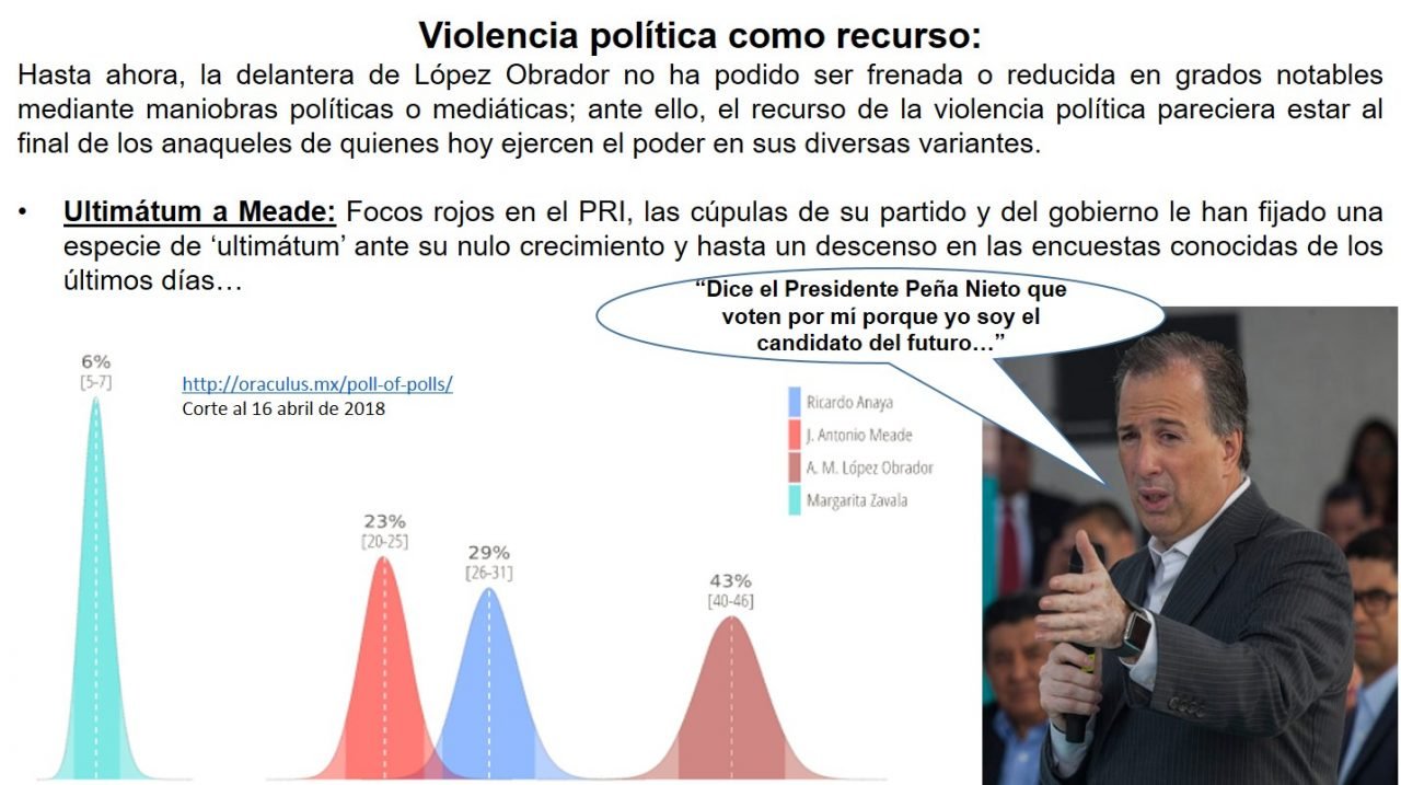 Julio Hernández López, escribe en La Jornada que la violencia (no sólo verbal) va subiendo de tono: “Y polémicas organizaciones sociales han aparecido en escena: el movimiento antorchista (Antorcha Campesina, su ramal más conocido) y el movimiento oaxaqueño de profesores disidentes. A la primera agrupación, el ya virtualmente priísta José Antonio Meade la ha exhortado a frenar a Andrés Manuel López Obrador; éste, a su vez, ha sido acusado por Meade de ser el animador y alimentador de la intolerancia de ciertos grupos de trabajadores de la educación. Los escenarios de la evolución violenta también son preocupantes: el estado de México (con Alfredo del Mazo como actual gerente), con el antorchismo aliado al gobierno priísta dinástico, y Oaxaca, con el muratismo especializado en simulaciones y escalamiento de conflictos. El reciente giro en ascenso de esa violencia electoral apenas velada ha descompuesto los cuidados perfiles de los dos contendientes principales: Andrés Manuel López Obrador no ha querido dar una respuesta formal y precisa respecto de los graves señalamientos priístas en su contra por los sucesos violentos de Oaxaca (donde cetemistas y miembros de la sección 22 se enfrentaron y luego cruzaron acusaciones dando cada cual al otro como provocador) y, por el contrario, ha optado por el tono chabacano, forzando rimas al motejar al tecnócrata Meade como una ternurita a la cual instó a apurarse porque le va a ganar Margarita (Zavala). El pentasecretario, por su parte, tuiteó este domingo: Espero que ahora que pierdas por tercera vez, no pierdas el buen humor, Andrés. #AndrésPerderásOtraVez. Suele advertirse de la condición preparatoria de la violencia verbal hacia la física. México es un país altamente violento y, en ese encuadre, el proceso electoral ha ido mostrando las evidencias de esa realidad, en particular por cuanto al asesinato de funcionarios, políticos y candidatos. Ayer mismo fue ejecutado el presidente de un pequeño municipio jalisciense, quien pretendía buscar la continuidad en el cargo. Este año se han conocido, más que nunca, renuncias y denuncias de ciudadanos encaminados a buscar cargos políticos, los cuales fueron amenazados por grupos criminales para que desistieran de esos propósitos. Hasta ahora, la delantera de López Obrador no ha podido ser frenada o reducida en grados notables mediante maniobras políticas o mediáticas. Defectos, errores e incongruencias del tabasqueño y de Morena han resultado minucias absolutamente digeribles por el cuerpo social hastiado de los terribles excesos de los adversarios políticos del sedimento de cambio que, aun en el peor de los casos, ofrecería ese lopezobradorismo, cuyo blindaje parecería ponerlo a salvo de cuanta treta y suciedad política le pudiera ser lanzada a lo largo de los próximos dos meses y medio. El recurso de la violencia política pareciera estar al final de los anaqueles de quienes hoy ejercen el poder en sus diversas variantes. Una de las opciones de quienes ven un competidor con tal ventaja sería impedir que se cumpla el itinerario, provocar las condiciones adecuadas para que el concurso no pueda cumplirse y, en todo caso, propiciar su reorganización, con nuevas reglas y en distintas condiciones. Desde luego, existe y subsiste la tentación drástica de complicar todo de tal manera que pueda darse como ganador al rezagado, en un golpe electoral que vaya más allá de lo sucedido recientemente en Coahuila y en el Estado de México”.