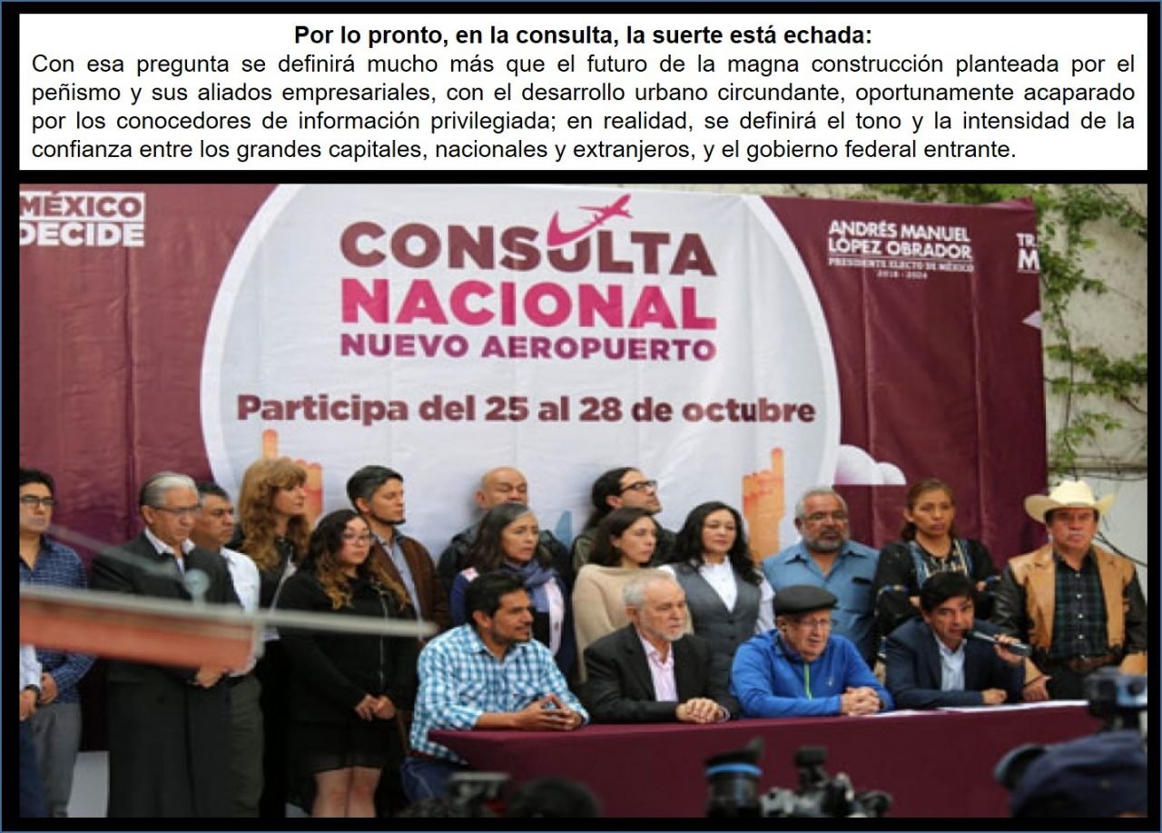 Julio Hernández López, en La Jornada, escribe sobre la consulta que: “Develada la pregunta única, continúan los enigmas y las inquietudes. Dudan de la eficacia de los mecanismos y de la confiabilidad de los resultados quienes son adversos a la consulta extraoficial (lo es en cuanto no ha sido convocada ni será supervisada por ninguna autoridad en funciones). Consideran que todo es manipulable y difícilmente aceptarían que de un proceso aún insuficientemente explicado pudiera derivarse un no a la cuantiosa inversión aeroportuaria en el lago de Texcoco. Y, por otra parte, algunos de quienes rechazan la continuación del proyecto de nuevo aeropuerto temen que las consideraciones ecológicas, técnicas, económicas y políticas puedan ser superadas artificialmente mediante trampas, por más que la próxima consulta pretenda ser inscrita en un hipotético contexto de nueva democracia infalsificable, que según eso se desprendería de la anómala lisura del pasado uno de julio. En el mundillo de la eterna suspicacia generó, desde luego, lecturas controvertidas el que en primer lugar se hubiera colocado la opción de diseño más reciente, la que combina las posibilidades rehabilitadas de los actuales aeropuertos capitalino y toluqueño, más dos pistas en Santa Lucía. Además, dado que el reacondicionamiento de los aeropuertos de Ciudad de México y de la capital del estado de México se anunciaron como obras de realización obligada por las circunstancias, sin relación directa con el diferendo estricto entre Texcoco y AICM-Santa Lucía, parecería desbalanceado asentar esas rehabilitaciones en un solo casillero. Otro punto polémico es el del financiamiento de esa consulta: Porfirio Muñoz Ledo dijo que los diputados de Morena no desembolsarán dinero para ese propósito, como había comentado el vocero de la presidencia electa, Jesús Ramírez Cuevas. Por lo pronto, la suerte está echada: con esa pregunta se definirá mucho más que el futuro de la magna construcción planteada por el peñismo y sus aliados empresariales, con el desarrollo urbano circundante, oportunamente acaparado por los conocedores de información privilegiada; en realidad, se definirá el tono y la intensidad de la confianza entre los grandes capitales, nacionales y extranjeros, y el gobierno federal entrante. Atenazado por la realidad económica globalizada, y el nada sutil amago local, pero al mismo tiempo comprometido con la corriente social que rechaza el aeropuerto texcocano, López Obrador necesita barajar más respuestas (otras), las suficientes para tratar de evitar un choque fuerte con los grandes capitales o con una parte de su amplia base social de apoyo”.
