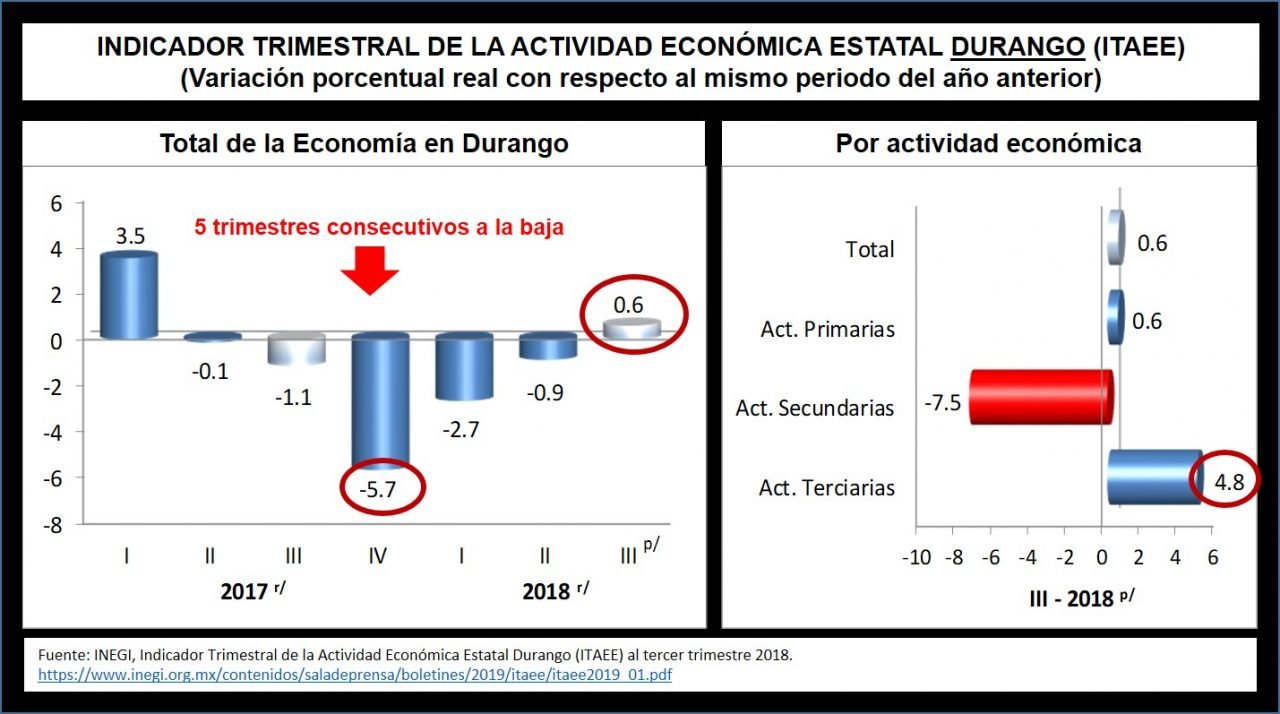 La economía de Durango en su conjunto creció 0.6% a tasa anual, de julio a septiembre del año pasado; por abajo del crecimiento nacional de 2.2%. Estamos en el lugar 24 respecto a las tasas de crecimiento del PIB de entre las 32 entidades federativas. Como se aprecia, luego de cinco trimestres consecutivos con tasas negativas de crecimiento económico, se trata de una buena noticia, pero es producto más de la inercia del comercio y los servicios; es decir, las actividades terciarias que durante el lapso de julio a septiembre 2018, crecieron 4.8%. De las actividades secundarias no podemos argumentar la misma suerte (-7.5%) dramática caída, y tampoco de las actividades primarias que solo aportaron 0.6% de crecimiento.