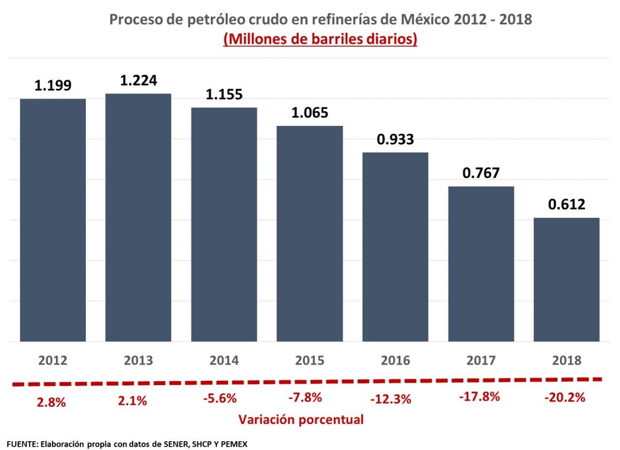 La construcción de la refinería de Dos Bocas, uno de los grandes proyectos energéticos del gobierno de AMLO, provocó divergencias entre la SENER y SHCP. Mientras, la producción de gasolina ha venido a la baja en las seis refinerías que operan en el país. Entre 2012 y 2018, de acuerdo a datos de la SENER, SHCP y PEMEX, el proceso de petróleo crudo en las seis refinerías del país, cayó 49%, quedando en poco más de 600 mil barriles diarios en 2018.