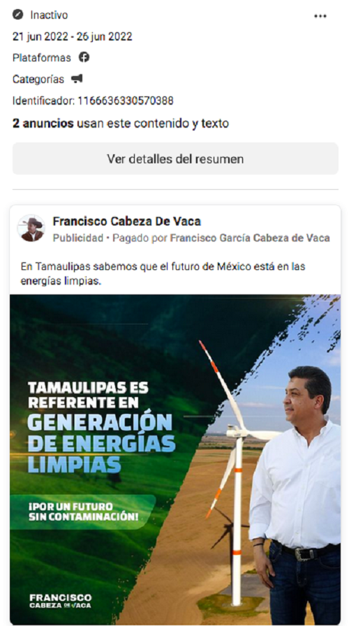 Otro de los gobernadores que ha gastado en publicidad de redes es Francisco Javier García Cabeza de Vaca: ha pagado 603 mil 689 pesos de enero a julio por anuncios en Facebook e Instagram. El costo de cada uno de estos mensajes va desde los 599 pesos hasta los 70 mil.