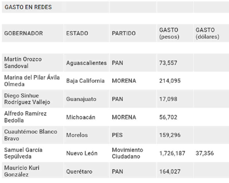 Los gobernadores que más han gastado en promover su imagen son el emecista Samuel García Sepúlveda (Nuevo León) y el panista Mauricio Vila Dosal (Yucatán). Le siguen Javier García Cabeza de Vaca (Tamaulipas); Ricardo Gallardo Cardona (San Luis Potosí); Marina del Pilar Ávila Olmeda (Baja California); Cuitláhuac García Jiménez (Veracruz); Mauricio Kuri González (Querétaro); Cuauhtémoc Blanco Bravo (Morelos); Martín Orozco Sandoval (Aguascalientes); Alfredo Ramírez Bedolla (Michoacán); David Monreal Ávila (Zacatecas) y Diego Sinhue Rodríguez Vallejo (Guanajuato).
