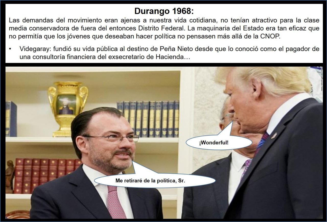 Desde la redacción de @loscabareteros ponemos a su consideración la “Columna de columnas nacional” del miércoles 03 de octubre de 2018. Durango 1968: Las demandas del movimiento eran ajenas a nuestra vida cotidiana, no tenían atractivo para la clase media conservadora de fuera del entonces Distrito Federal. La maquinaria del Estado era tan eficaz que no permitía que los jóvenes que deseaban hacer política no pensasen más allá de la CNOP. Videgaray: fundió su vida pública al destino de Peña Nieto desde que lo conoció como el pagador de una consultoría financiera del exsecretario de Hacienda… 2-O: lo oficial y lo popular… De NAFTA a USMCA.