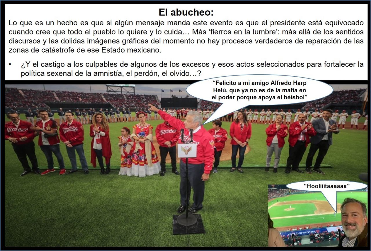 Roy Campos, en El Economista, escribe que: “El sábado 23 de marzo, en la inauguración del estadio de beisbol Alfredo Harp Helú que será sede de los Diablos Rojos del México, se presentó un momento de abucheo al presidente López Obrador que inmediatamente se viralizó en redes sociales. Al respecto expongo algunos puntos que tienen que ver con popularidad y forma de manifestarse entre otras cosas: 1. Es evidente que no todos los mexicanos quieren a López Obrador. En el estadio había un grupo grande que no lo quería, así que quien piense que el presidente es querido en todos lados y por todos se equivoca. (…) 2. En mi opinión AMLO reacciona mal, porque nuevamente polariza al descalificar a los que abuchean con el epíteto de “fifís”. (…) 3. La “prueba del estadio” es un reto muy difícil para cualquier mandatario, casi imposible. Desde aquel 1986 en la inauguración del Mundial de Futbol, cuando le dieron tremendo abucheo a Miguel de la Madrid en el Estadio Azteca, es muy difícil que un mandatario “salga vivo” de uno. (…) 4. El abucheo en el estadio no se debió a ningún acto específico sino a posiciones ya tomadas respecto a López Obrador. Es decir, no es un abucheo por la reforma educativa o por la reforma energética o por el aeropuerto, es un abucheo de ciudadanos que tienen una opinión tomada previamente sobre López Obrador y no por recientes actos de gobierno. (…) 5. Definitivamente el abucheo le significó un muy mal día al presidente y uno muy bueno para quienes no lo quieren. Para ellos, el haberle mostrado el desacuerdo de esa manera les otorga un triunfo como si hubieran ganado una elección. (…) 6. ¿Afecta esto su popularidad? No sé, depende de reacciones del propio López Obrador y de otras variables muy alejadas del estadio (empleo, seguridad, programas sociales, inflación). Lo que es un hecho es que si algún mensaje manda este evento es que el presidente está equivocado cuando cree que todo el pueblo lo quiere y lo cuida. No es así”.