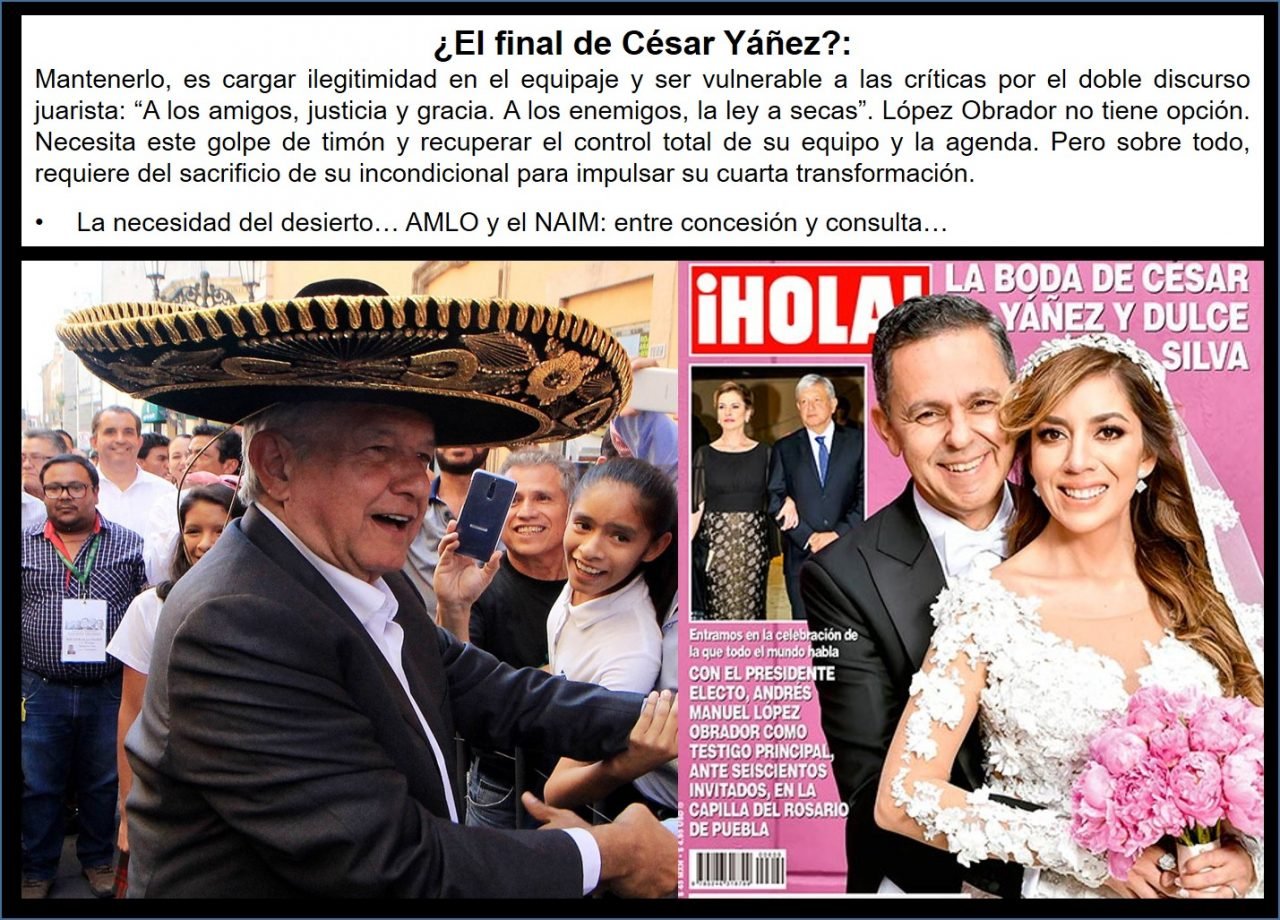 Hace dos semanas comenzó la gangrena en el corpus político de Andrés Manuel López Obrador. La contaminación comenzó cuando se filtró en las redes sociales el menú del banquete de la boda de César Yáñez, su incondicional escudero de décadas, con la abogada Dulce Silva, que sugería una opulencia que chocaba con la conducta pública de austeridad que él mismo había mostrado por años, y sobre todo, contradecía todo el discurso del presidente electo. El incipiente escándalo escaló a niveles inimaginables en el contexto de López Obrador, cuando la boda apareció en la portada de la revista ¡Hola!, dándoles un tratamiento que le dan a la aristocracia. La molestia de López Obrador se sintió desde la misma cena de la boda hace dos sábados, y llevó a Yáñez a la congeladora, que aún no ha sentido el rigor del enojo por encontrarse de luna de miel en París. Las críticas no han cejado, con lo cual ha tenido un costo para López Obrador, que aún no se puede medir en imagen, pero sí en la sociedad política, donde se han transferido los reclamos al presidente electo por el hecho de su proximidad. No va a parar este frenesí. Varios medios de comunicación están investigando quién pagó la boda y la portada y 19 páginas más de ¡Hola!, lo que podría ser aún más embarazoso si se descubriera que no sólo fue la familia de la hoy esposa –de acuerdo con la tradición mexicana de quién se hace cargo del evento–, sino alguien más. Las pistas sobre una parte de la cobertura de los gastos apuntan hacia el gobernador Antonio Gali. Funcionarios poblanos no negaron ni confirmaron que el gobernador haya sido uno de los financieros, pero admitieron que hubo elementos de la boda que establecen relación circunstancial. Por ejemplo, la banda de Los Ángeles Azules es frecuentemente contratada por el gobierno de Puebla para sus eventos. Igual sucede con Julián Jalil, un organizador de eventos y banquetes muy afamado en Puebla. El balcón del Centro de Convenciones donde se realizó la boda civil, con López Obrador como testigo principal, no pudo haberse otorgado sin autorización del gobierno, como tampoco el salón más grande de ese centro, donde fue el banquete. (…) Yáñez dejó de ser un activo para convertirse en lastre. Pero al mismo tiempo, su leal colaborador puede hacerle un enorme servicio, no por lo que pueda hacer él mismo, sino por lo que puede hacer López Obrador con él: despedirlo. No basta que Yáñez renuncie a estar en el próximo gobierno, con lo cual atenuaría la crítica, sino que tiene que ser cesado. Si López Obrador lo hace, enviará una doble señal, hacia dentro de su equipo, en el sentido que no habrá tolerancia ante ningún exceso, y hacia fuera, se revestirá de una mayor autoridad moral para combatir los abusos y los actos de corrupción. Inclusive, podría no proceder penalmente contra un funcionario del pasado, porque habrá demostrado que no le tiembla la mano para ello ni responde a compromisos ocultos, sino al ejercicio de la política sin venganzas. Esta decisión debe ser emocionalmente muy dolorosa. Yáñez fue quien lo acompañó cada vez que se refugiaba en el México pobre a recuperarse de sus derrotas y prestarle el hombro de apoyo. Era parte de su familia. Pero mantenerlo, es cargar ilegitimidad en el equipaje y ser vulnerable a las críticas por el doble discurso juarista: “A los amigos, justicia y gracia. A los enemigos, la ley a secas”. Visto fríamente, López Obrador no tiene opción. Necesita este golpe de timón y recuperar el control total de su equipo y la agenda. Pero sobre todo, requiere del sacrificio de su incondicional para impulsar su cuarta transformación”.