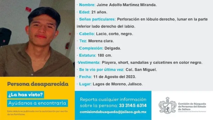 A Jaime, un joven de 20 años de edad, su familia lo describe como una persona muy alegre que le encantaba bailar. Peso Pluma y Junior H. eran los artistas preferidos del muchacho, quien se desempeñaba como albañil. El día de su desaparición portaba short, playera, sandalias y calcetines color negro. Además de una perforación en el lóbulo derecho.