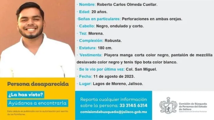 Roberto Olmeda Cuéllar, Diego Lara Santoyo, Uriel Galván, Jaime Adolfo Martínez Miranda y Dante Cedillo Hernández son los cinco jóvenes provenientes del municipio de Lagos de Moreno, Jalisco, quienes desde la noche del pasado 11 de agosto permanecen en calidad de desaparecidos luego de que se reunieron para acudir a la feria de dicho municipio.