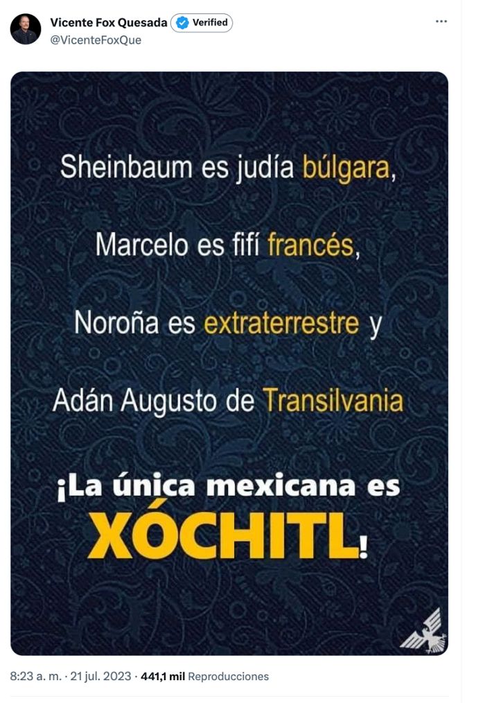 Fox publicó una imagen en redes sociales donde enlista a los aspirantes del oficialismo: [Claudia] Sheinbaum es judía búlgara, Marcelo [Ebrard] es fifí francés, [Gerardo Fernández] Noroña es extraterrestre y Adán Augusto [López] es de Transilvania. ¡La única mexicana es Xóchitl!”, dice la imagen.