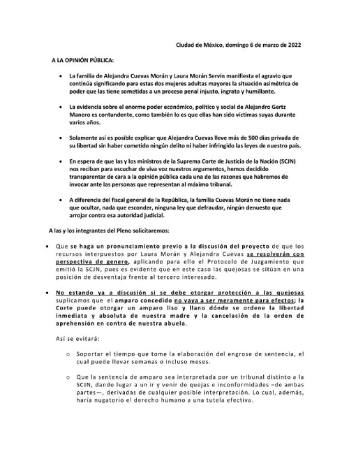 «No estando ya a discusión si se debe otorgar protección a las quejosas suplicamos que el amparo concedido no vaya a ser meramente para efectos; la Corte puede otorgar un amparo liso y llano donde se ordene la libertad inmediata y absoluta de nuestra madre y la cancelación de la orden de aprehensión en contra de nuestra abuela», pidieron a los integrantes de la Corte.
