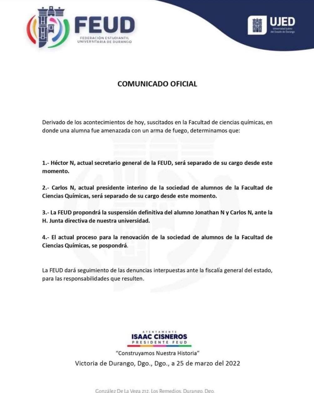 Héctor «N», secretario General de la Federación Estudiantil Universitaria de Durango (FEUD), y Carlos «N», presidente interino de la Sociedad de Alumnos de la Facultad de Ciencias Químicas de la Universidad Juárez del Estado de Durango (UJED), fueron separados de sus cargos tras ser acusados de amenazar con un arma de fuego a Berenice, también alumna de la máxima casa de estudios.
