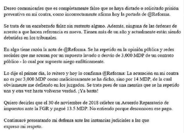 “Lo dije el primer día, lo reitero y hoy lo confirma @Reforma: La acusación en mi contra no es por 3,000 MDP como maliciosamente se ha dicho, sino por 14 MDP, de la cual obviamente me defiendo en los juzgados. Se trata pues de una mentira que se ha repetido una y otra vez hasta volverse verdad. ¡Ya basta!”, afirmó.
