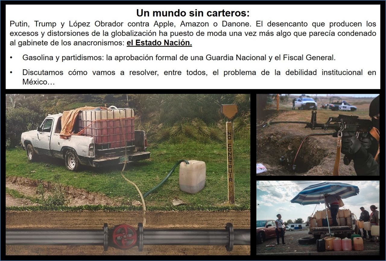 Desde la redacción de @loscabareteros ponemos a su consideración la “Columna de columnas nacional” del lunes 07 de enero 2019. Un mundo sin carteros: Putin, Trump y López Obrador contra Apple, Amazon o Danone. El desencanto que producen los excesos y distorsiones de la globalización ha puesto de moda una vez más algo que parecía condenado al gabinete de los anacronismos: el Estado Nación. Gasolina y partidismos: la aprobación formal de una Guardia Nacional y el Fiscal General. Discutamos cómo vamos a resolver, entre todos, el problema de la debilidad institucional en México…