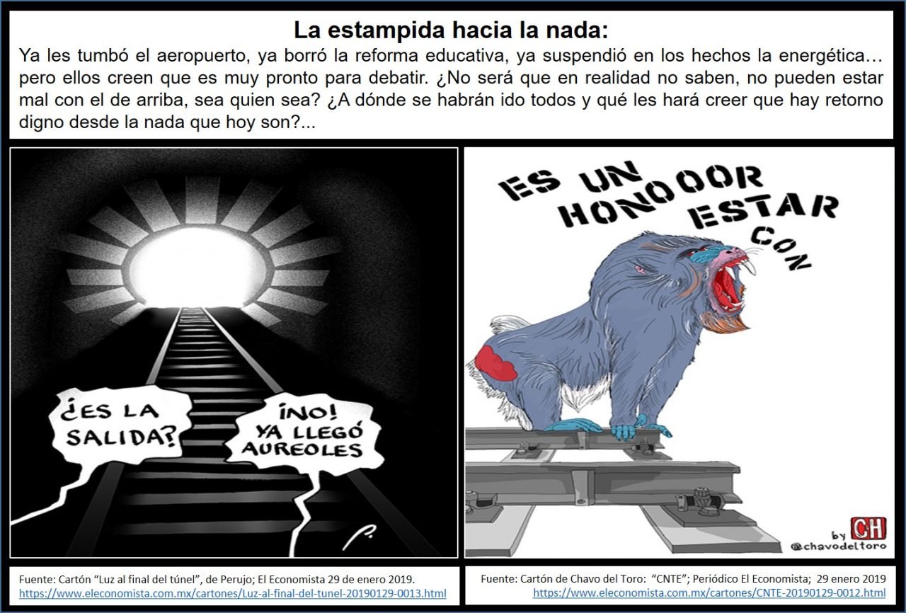 Desde la redacción de @loscabareteros ponemos a su consideración la “Columna de columnas nacional” del martes 29 de enero 2019. La estampida hacia la nada: Ya les tumbó el aeropuerto, ya borró la reforma educativa, ya suspendió en los hechos la energética… pero ellos creen que es muy pronto para debatir. ¿No será que en realidad no saben, no pueden estar mal con el de arriba, sea quien sea? ¿A dónde se habrán ido todos y qué les hará creer que hay retorno digno desde la nada que hoy son?