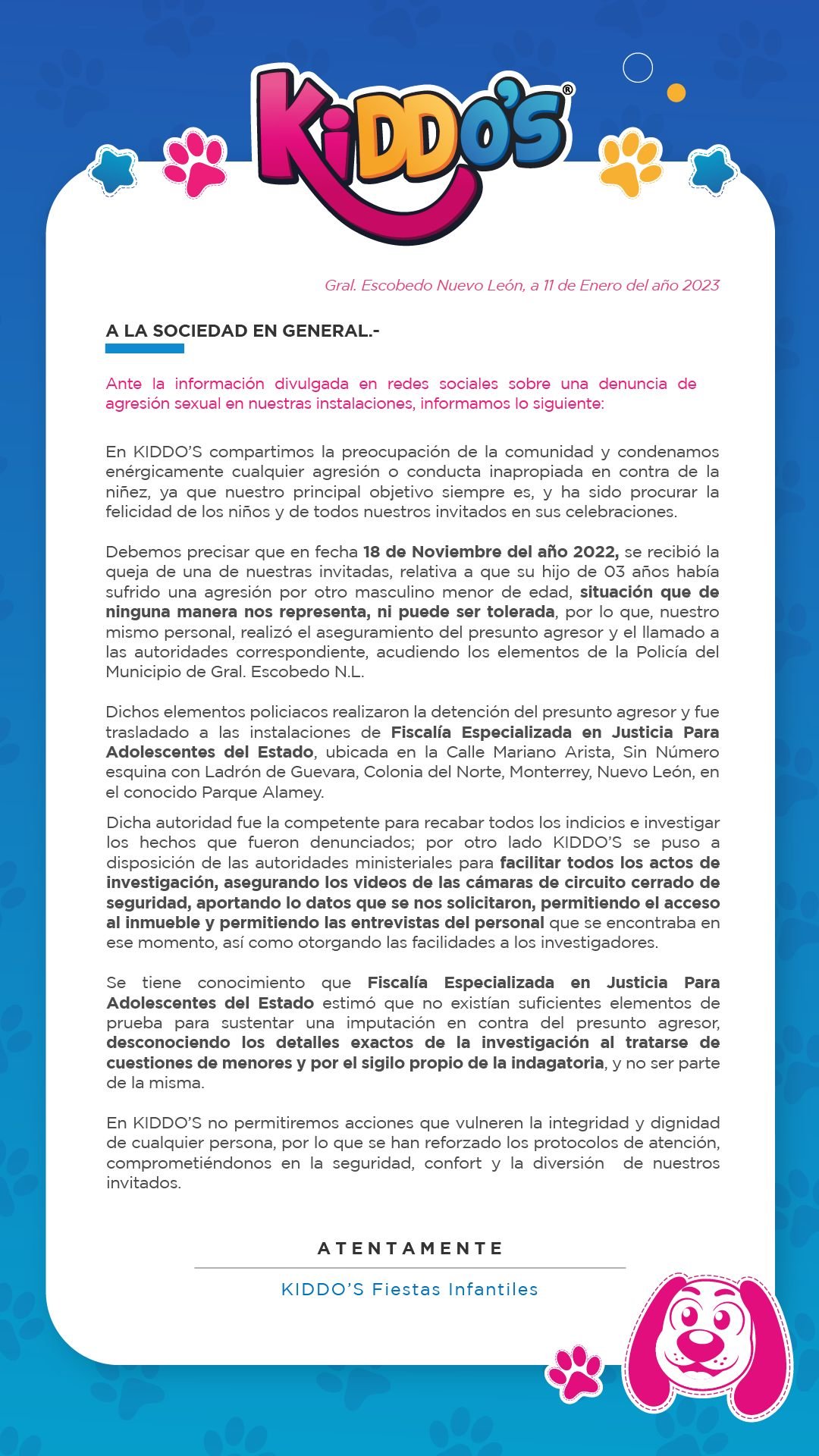 En un comunicado difundido este miércoles, Kiddo’s Salón de Fiestas Infantiles señaló, sobre la denuncia de agresión sexual, que la Fiscalía Especializada en Justicia para Adolescentes del Estado “estimó que no existen suficientes elementos de prueba para sustentar una imputación en contra del presunto agresor”.