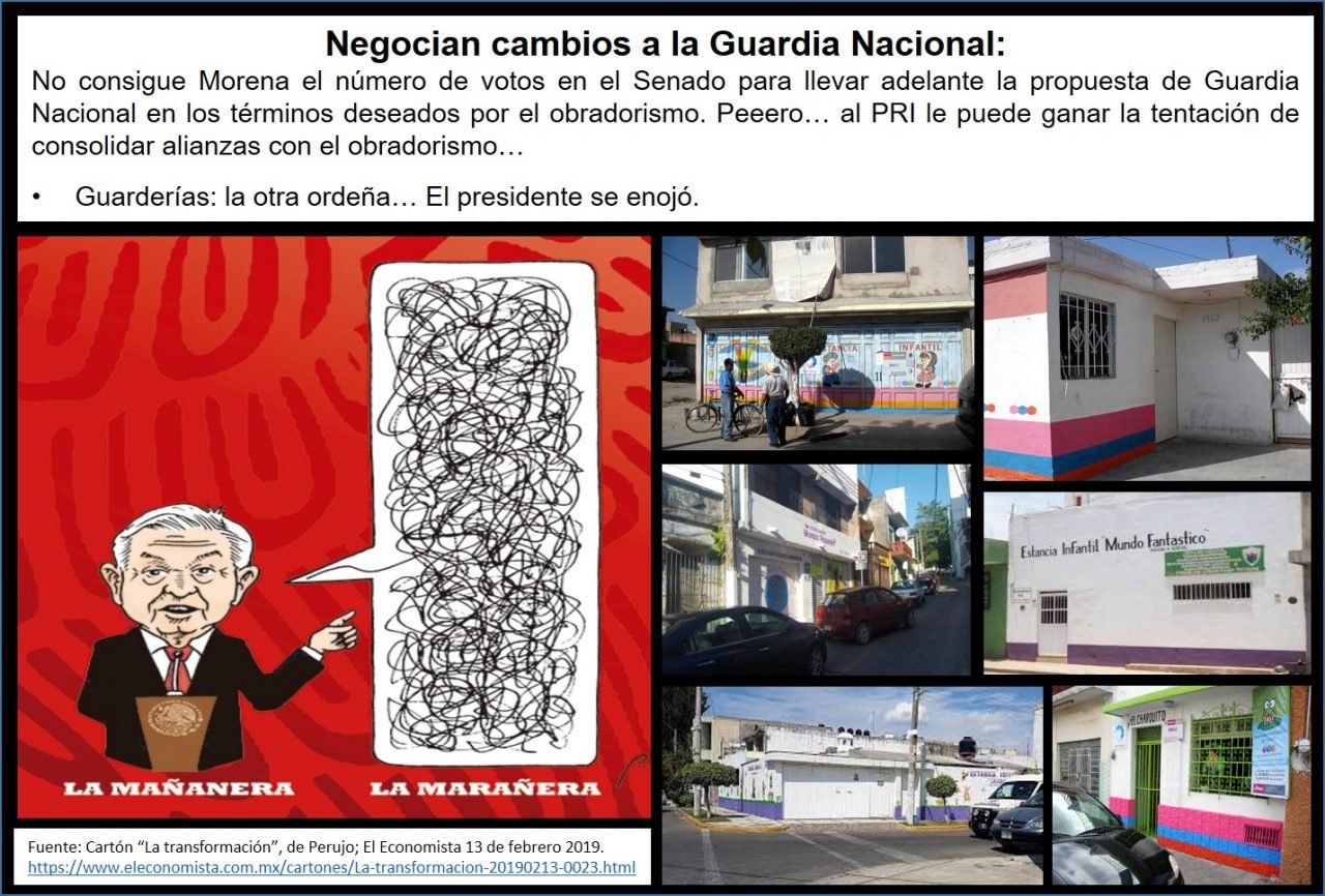 Julio Hernández López, en La Jornada, escribe que: “No consigue Morena el número de votos en el Senado para llevar adelante la propuesta de Guardia Nacional en los términos deseados por el obradorismo. Se requiere mayoría calificada y, hasta ahora, PRI, PAN y MC negocian una redacción distinta a la impulsada por Palacio Nacional. De modificar el proyecto morenista, sería la primera victoria política importante de la hasta ahora deshilachada oposición, que consiguió alargar la discusión, al obligar a que se instalara un parlamento abierto, y ahora está aparentemente en vías de evitar aristas del planteamiento de Guardia Nacional que incluso en privado algunos morenistas impugnan. Pero, siempre el pero, todo ese tinglado puede caerse si al PRI le gana la tentación de consolidar alianzas con el obradorismo”.