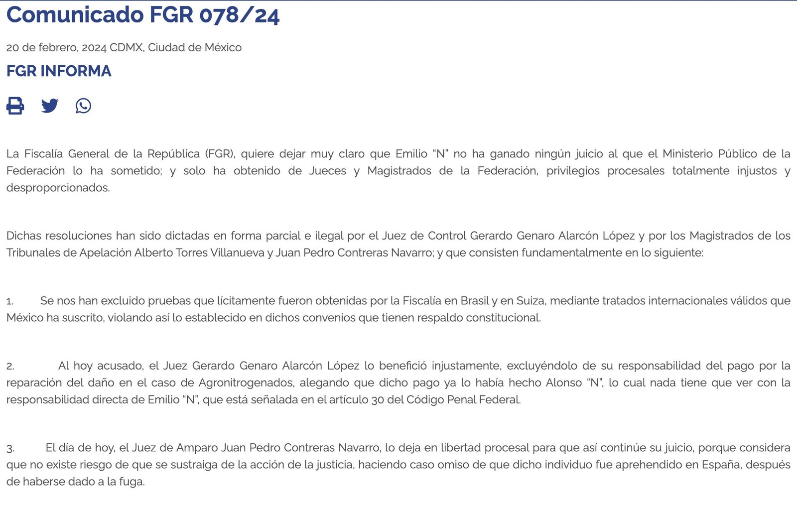 El Juez Gerardo Genaro Alarcón López lo «benefició injustamente, excluyéndolo de su responsabilidad del pago por la reparación del daño en el caso de Agronitrogenados, alegando que dicho pago ya lo había hecho Alonso “N”, lo cual nada tiene que ver con la responsabilidad directa de Emilio “N”, que está señalada en el artículo 30 del Código Penal Federal».