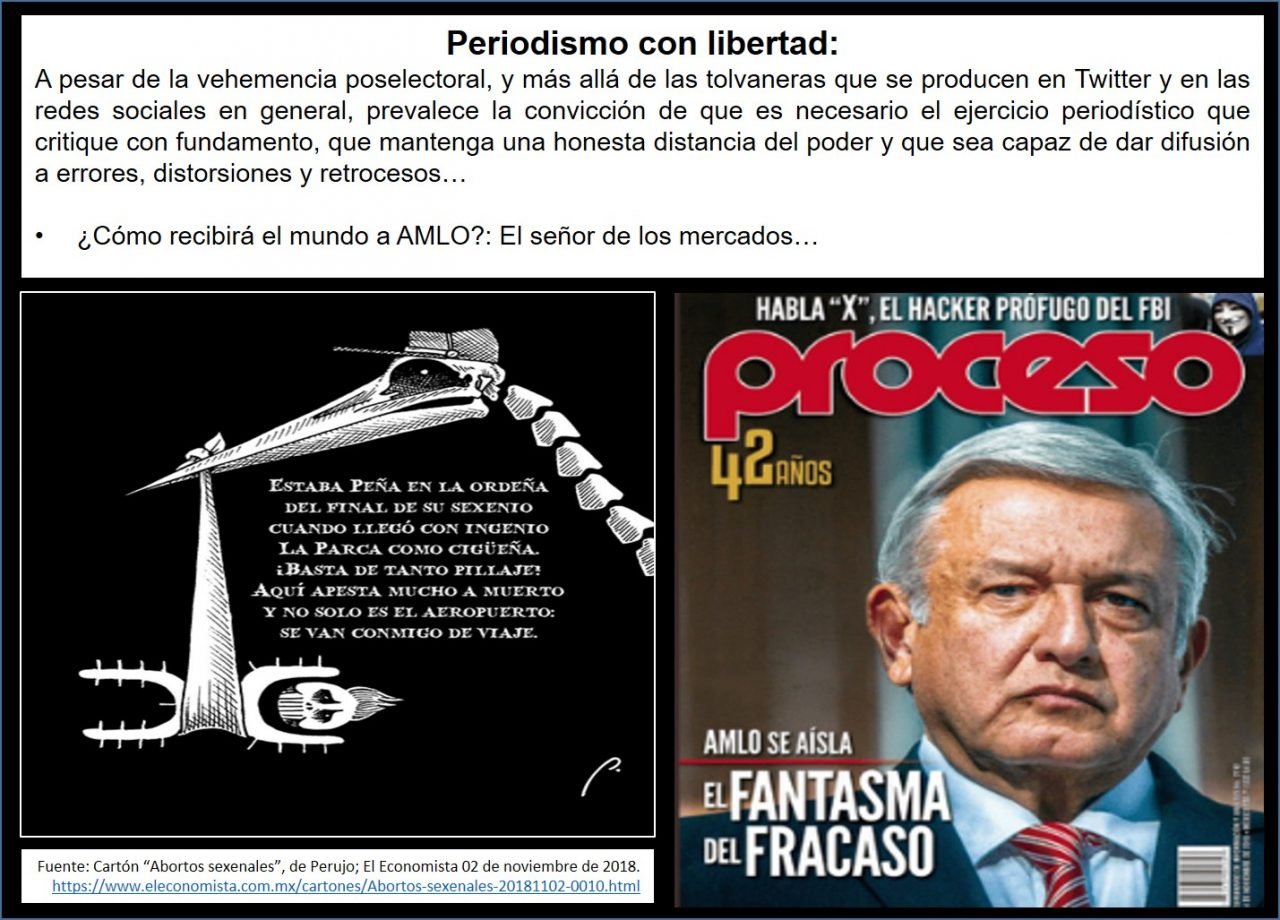 Julio Hernández López, en La Jornada: “La edición de la revista Proceso correspondiente a la semana en curso ha generado polémica a partir de los encabezados de su portada: El fantasma del fracaso, como principal, y AMLO se aísla, en el título secundario. Tales formulaciones tienen como sustento la entrevista que el reportero Álvaro Delgado hizo a Diego Valadés Ríos, un reconocido experto en constitucionalismo que ha ocupado las procuradurías de Justicia en el plano federal (al final de la administración de Carlos Salinas de Gortari) y en la capital del país (con Manuel Camacho como regente). (…) La entrevista a Valadés, sensata y atendible, a juicio del autor de estos teclazos astillados, busca advertir sobre los riesgos que corre el futuro gobierno lopezobradorista, construido con una alta carga de voluntad personal y aún sin el andamiaje institucional y de colectividad política bien organizada que requiere el tamaño de los cambios esperados. No es un ataque al político tabasqueño, pero sí un análisis de las debilidades y las fortalezas, con acento en éstas, de lo que puede suceder en la política mexicana del sexenio por iniciar, sobre todo si el equipo del tabasqueño, su gabinete y la fuerza de Morena, dominante del Congreso federal, no acompañan y apuntalan los esfuerzos del próximo presidente de la República. (…) El fondo de la discusión (más allá de especulaciones sobre sucesiones accionarias y perfiles políticos de herederos filiales) está en el papel que el periodismo crítico debe ejercer ante el nuevo poder presidencial, legitimado por un insólito volumen de votos y convertido en opción actualmente única de posibilidades de cambio (aunque sean leves y en circunstancias a veces contradictorias) de un sistema político y económico profundamente muy deteriorado. Para un segmento de los seguidores de AMLO la prensa crítica debe acompasarse con los planteamientos y las necesidades políticas del futuro gobierno. No asumir tal comportamiento significaría, bajo ese criterio, una suerte de traición y merecería fusilamiento cívico a partir de un juzgamiento sumario de presunta corrupción. Pero, a pesar de la vehemencia poselectoral, y más allá de las tolvaneras que se producen en Twitter y en las redes sociales en general, prevalece la convicción de que es necesario el ejercicio periodístico que critique con fundamento, que mantenga una honesta distancia del poder y que sea capaz de dar difusión a errores, distorsiones y retrocesos”.