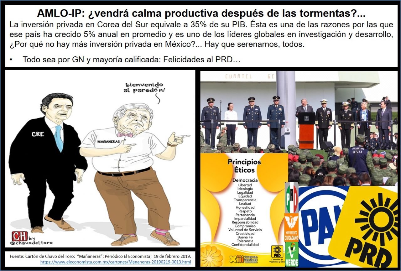 Desde la redacción de @loscabareteros ponemos a su consideración la “Columna de columnas nacional” del miércoles 20 de febrero 2019. AMLO-IP: ¿vendrá calma productiva después de las tormentas?… La inversión privada en Corea del Sur equivale a 35% de su PIB. Ésta es una de las razones por las que ese país ha crecido 5% anual en promedio y es uno de los líderes globales en investigación y desarrollo, ¿Por qué no hay más inversión privada en México?… Hay que serenarnos, todos. Todo sea por GN y mayoría calificada: Felicidades al PRD…