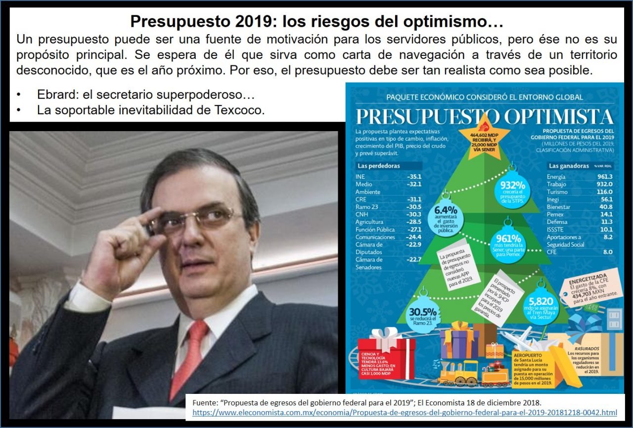 Desde la redacción de @loscabareteros ponemos a su consideración la “Columna de columnas nacional” del miércoles 19 de diciembre 2018. Presupuesto 2019: los riesgos del optimismo… Un presupuesto puede ser una fuente de motivación para los servidores públicos, pero ése no es su propósito principal. Se espera de él que sirva como carta de navegación a través de un territorio desconocido, que es el año próximo. Por eso, el presupuesto debe ser tan realista como sea posible. Ebrard: el secretario superpoderoso… La soportable inevitabilidad de Texcoco.