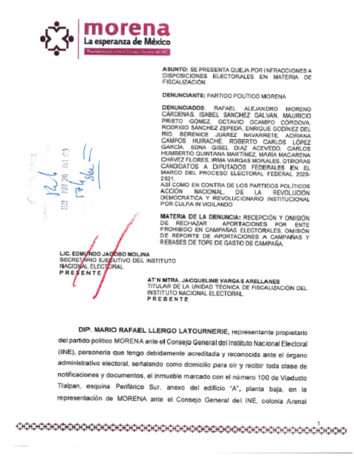 El domingo 22 de mayo, Morena presentó una ampliación de la queja, “por la omisión de reportar gastos de campaña y por la omisión de rechazar aportaciones de entes prohibidos”.