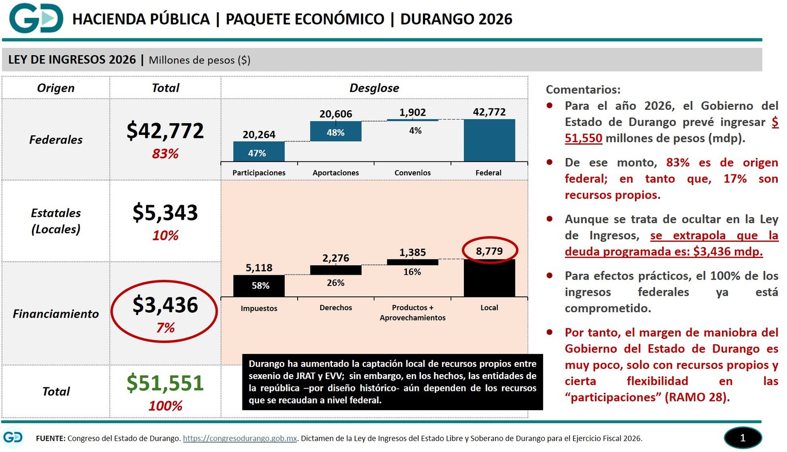 El Paquete Económico 2026 de Durango no es un plan de vuelo; es un acta de supervivencia. Tras analizar los $51,551 millones de pesos proyectados, la conclusión técnica es tan gélida como contundente: Durango ha claudicado a su capacidad de transformación para convertirse en una ventanilla de pagos. Somos una entidad que administra la escasez mientras el resto del mundo —y otros estados del norte— compite por el futuro.