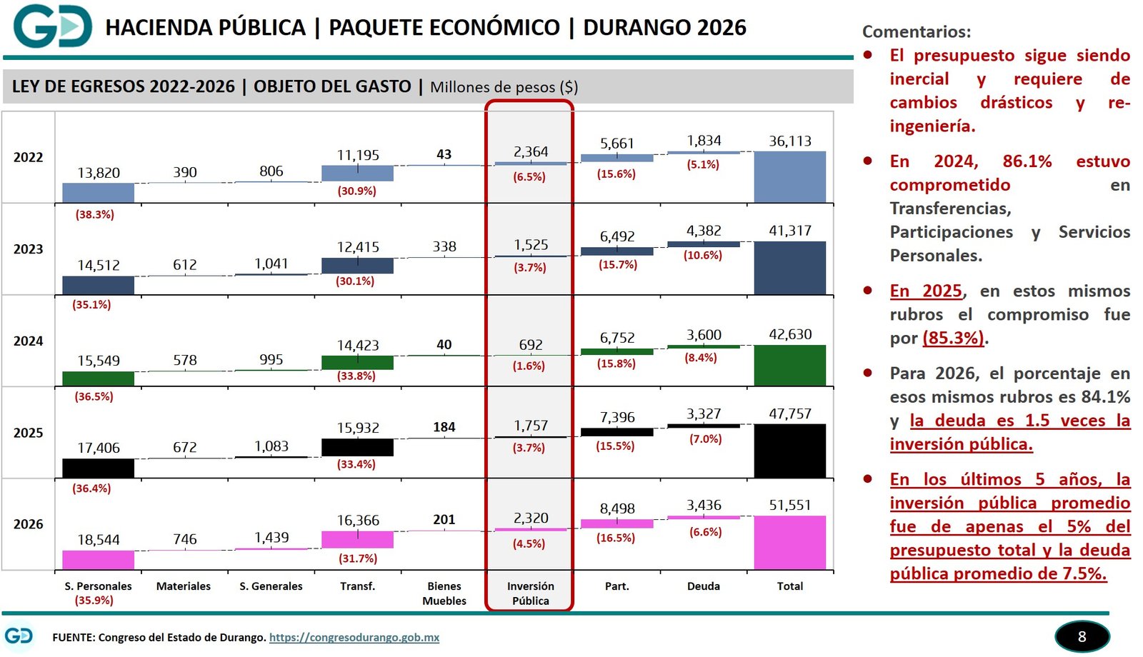 2. Reingeniería del Gasto Corriente (Base Cero): Es imperativo reducir la estructura administrativa en al menos un 15%. Durango no puede seguir manteniendo una nómina que absorbe el 36% del presupuesto total. Necesitamos un gobierno digital, compacto y técnico, no una agencia de colocación de empleo político. Cada peso ahorrado en burocracia debe ir etiquetado por ley a un Fondo de Infraestructura Productiva.