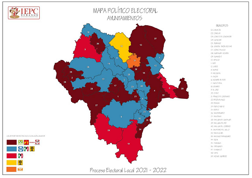 En el mapa oficial se observa que el 46 por ciento de los ayuntamientos en Durango serán gobernados por Morena y sus aliados, el 38.5 por ciento por la coalición Va por Durango, el 10 por ciento por el PRI, 2.5 por ciento por PRD y 2.5 por ciento por Movimiento Ciudadano.