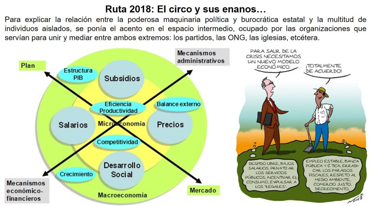 En la ciencia política tradicional se desarrolló un enfoque para examinar la relación Estado-sociedad que solía colocar a aquél en el extremo superior de un espectro de distribución del poder y, en el otro, a la masa ciudadana. Y para explicar la relación entre la poderosa maquinaria política y burocrática estatal y la multitud de individuos aislados, se ponía el acento en el espacio intermedio, ocupado por las organizaciones que servían para unir y mediar entre ambos extremos: los partidos, las ONG, las iglesias, etcétera.
